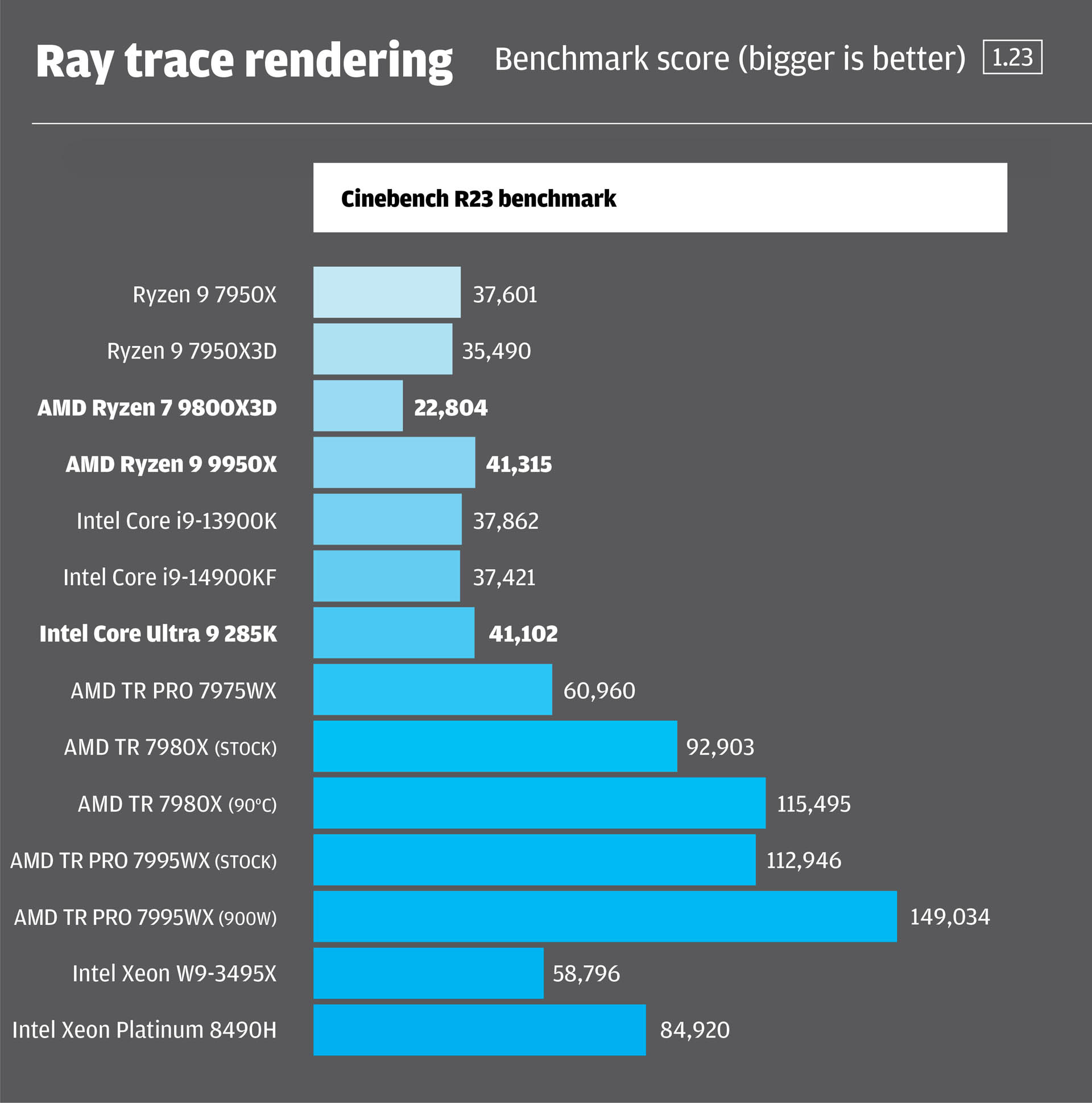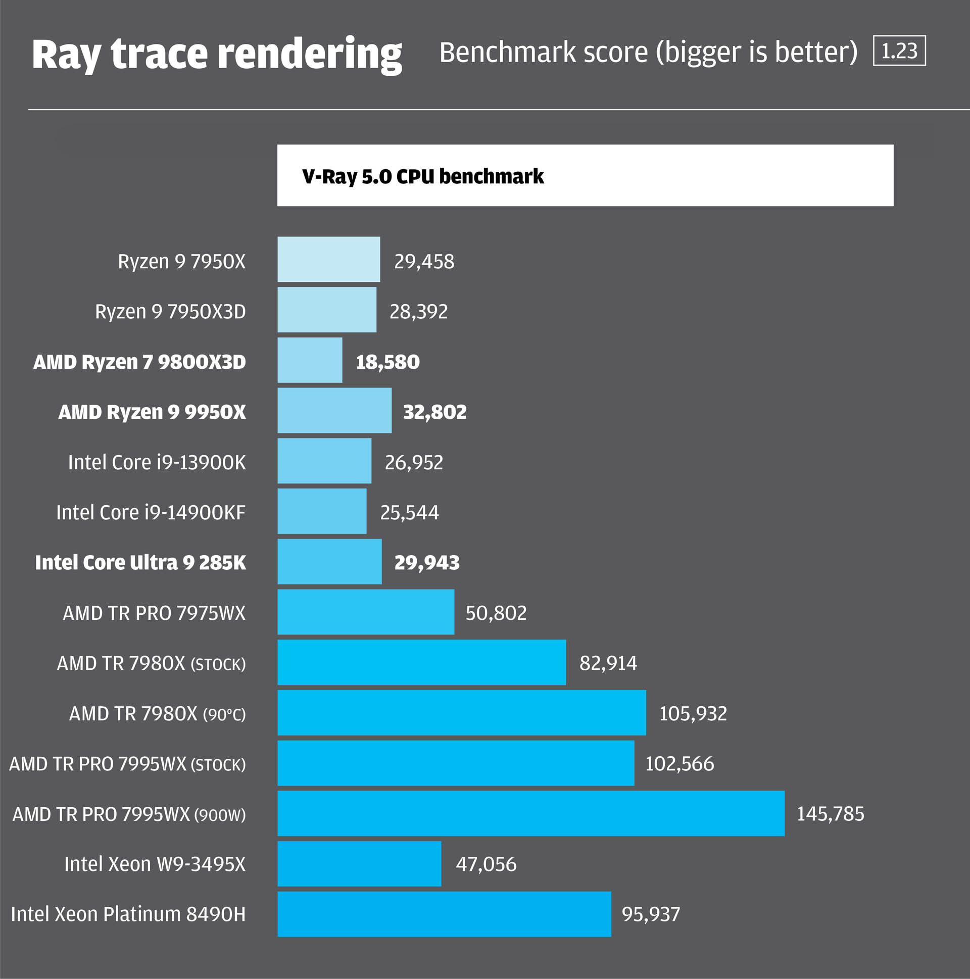 Ray trace rendering is exceptionally multithreaded, so can take full advantage of all CPU cores. Unsurprisingly, the processors with the highest core counts — the AMD Ryzen 9 9950X (16 cores) and Intel Core Ultra 9 285K (24 cores) — topped our tests.