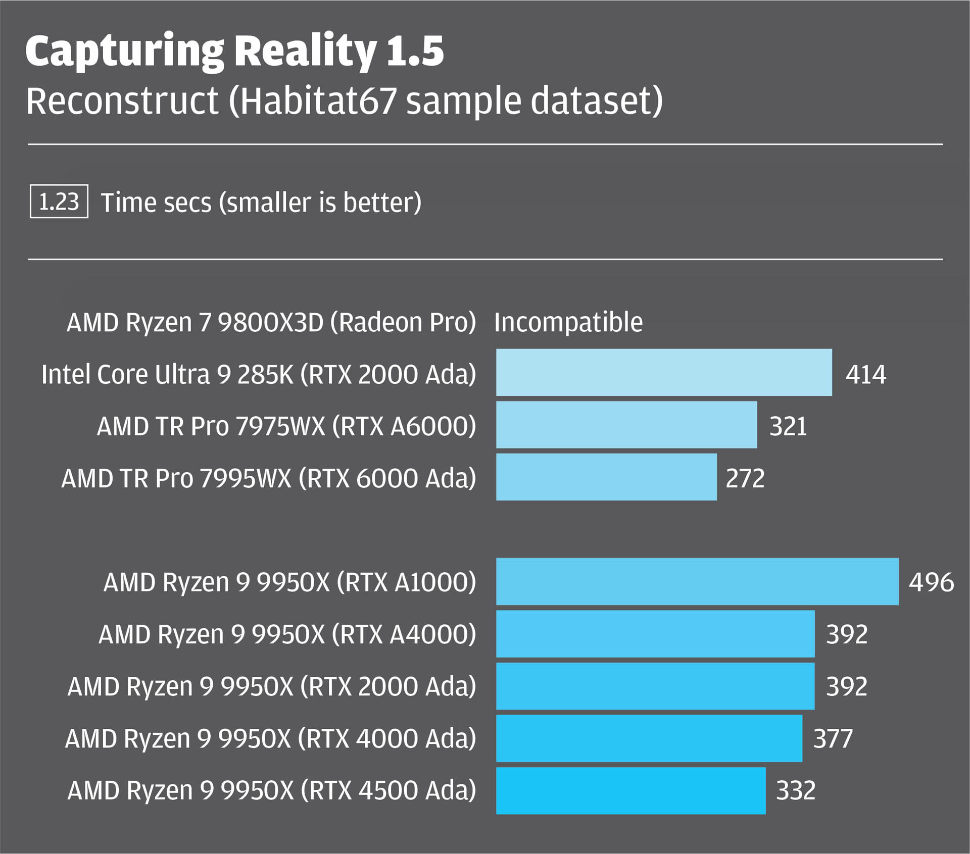 As many of the workflows in these applications are multi-threaded, we were surprised that the 8-core AMD Ryzen 9800X3D outperformed the 16-core AMD Ryzen 9950X and 24-core Intel Core Ultra 9 285K in several tests. This is likely due to its significantly larger cache, but possibly down to its single CCD design, which houses all 8 CPU cores.