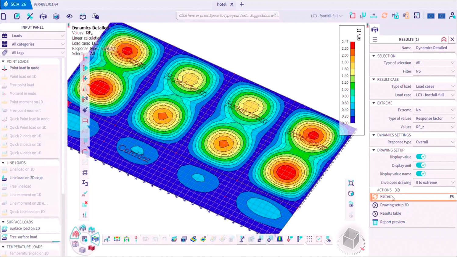 For buildings with large open areas, footbridges or lightweight floors, the new foot-fall (vibration) analysis capability allows engineers to model human-activity induced dynamic responses, helping to eliminate vibration issues and avoid costly modifications after construction.
