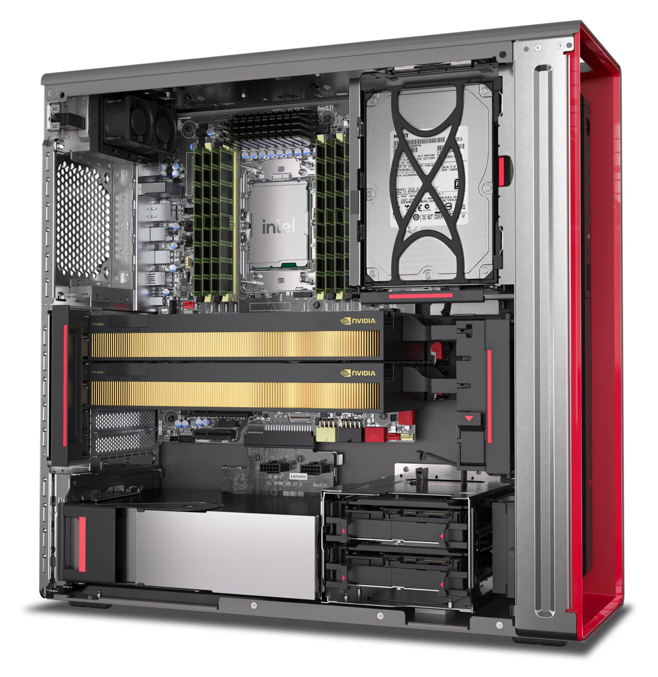 However, with four memory channels and up to 512 GB of memory it’s still a big step up from entry-level ‘Intel Core’ workstations with dual channel and 128 GB. The ThinkStation P5 can be configured with up to two dual-slot GPUs.