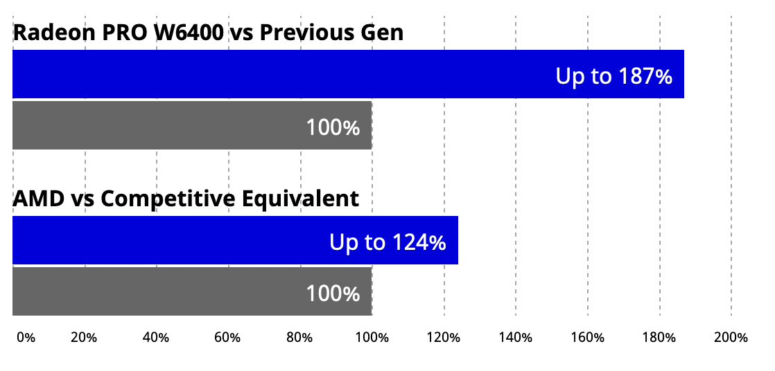 1. Testing conducted by AMD Performance Labs as of December 10, 2021 on a test system comprising Intel XeonW-2125 (Skylake-W) at 4Ghz, 32 GB system memory, Windows 10 Pro, Radeon PRO W6400 GPU pre-production sample with Radeon PRO Driver 21.40 Pre-release version / AMD Radeon™ PRO WX 3200 GPU with AMD Driver 21.Q3. Benchmark Application: Holomark 2 Benchmark/ PC manufacturers may vary configurations, yielding different results. Performance may vary based on use of latest drivers, production drivers and production silicon. RPW-393