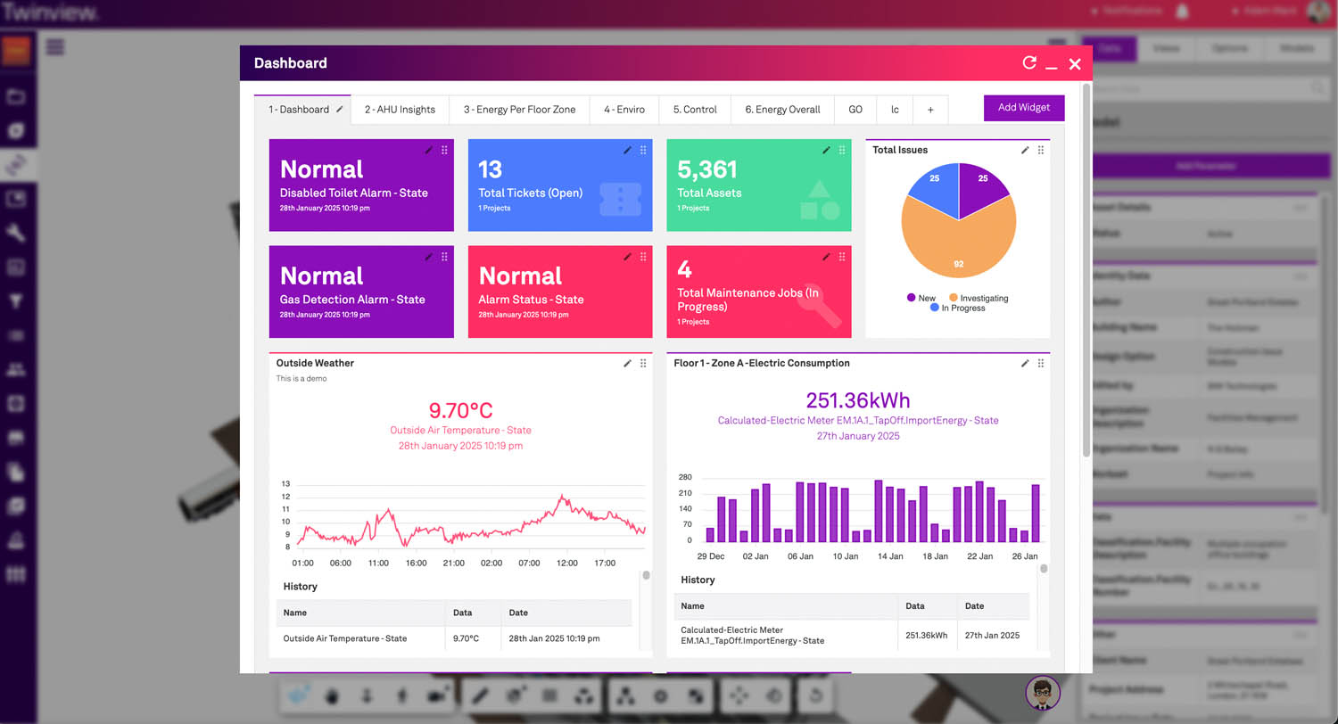 Twinview goes beyond the traditional digital twin model for operations and has been used to connect residents to live building information. On a residential project, tenants access the Twinview data on their mobile phones to see energy levels in the buildings, temperatures and CO2, all through their own app.